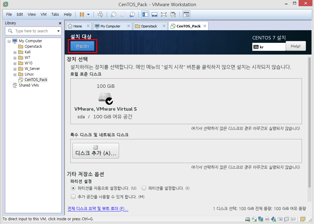1.21. "파티션을 자동 설정합니다" 기본적을 체크 되어 있음으로 "완료" 선택
