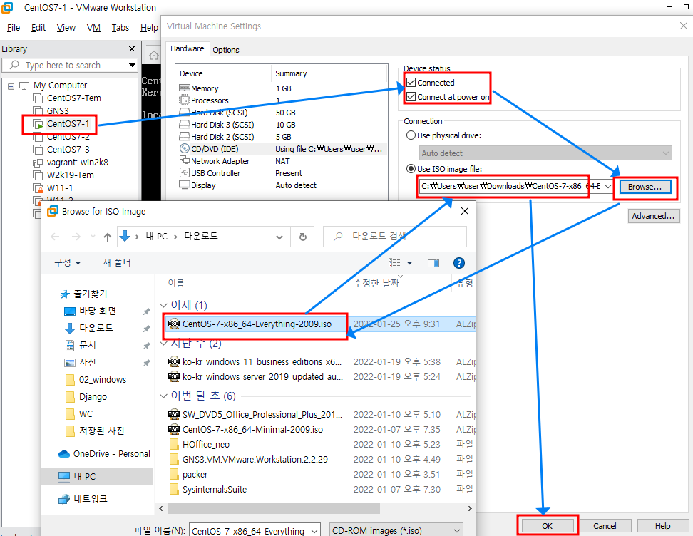 2.1. 다운로드한 ISO 파일을 VM의 CD-ROM에 장착합니다.