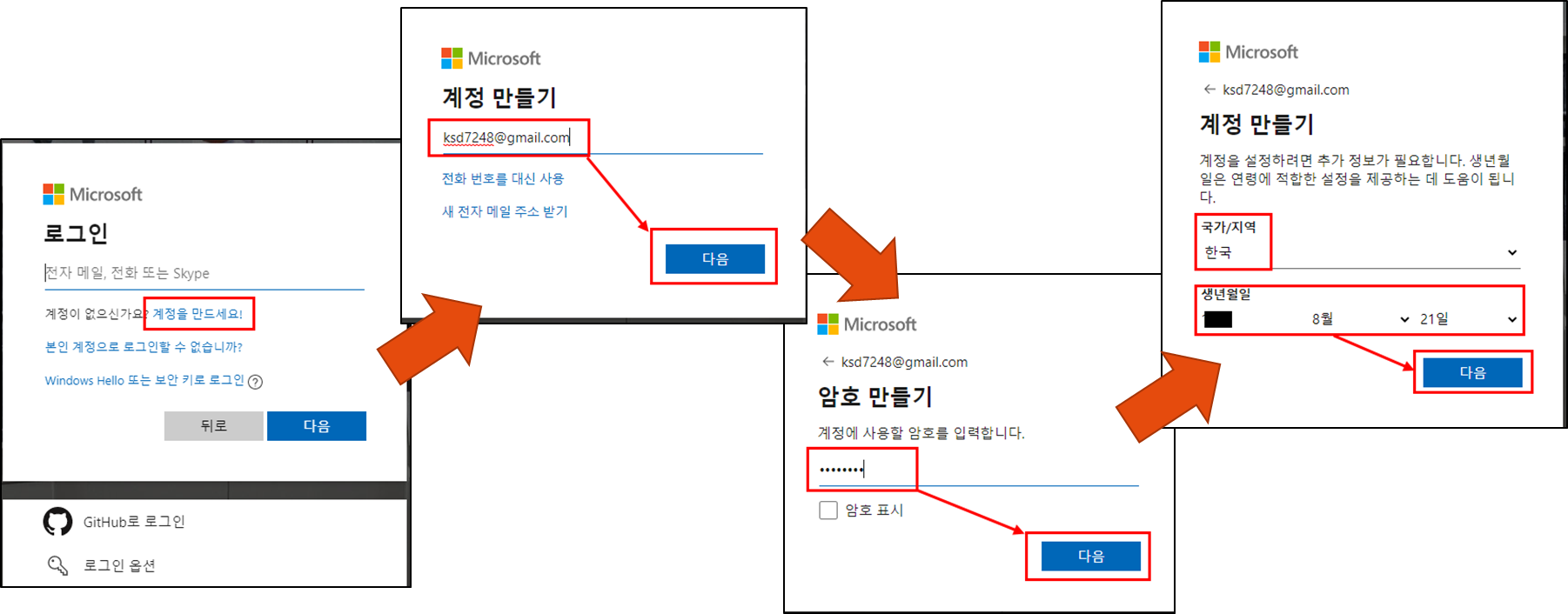 3.1. "계정을 만드세요" 클릭 -> 메일 주소 입력 -> 암호 -> 국가 및 생년월일 입력