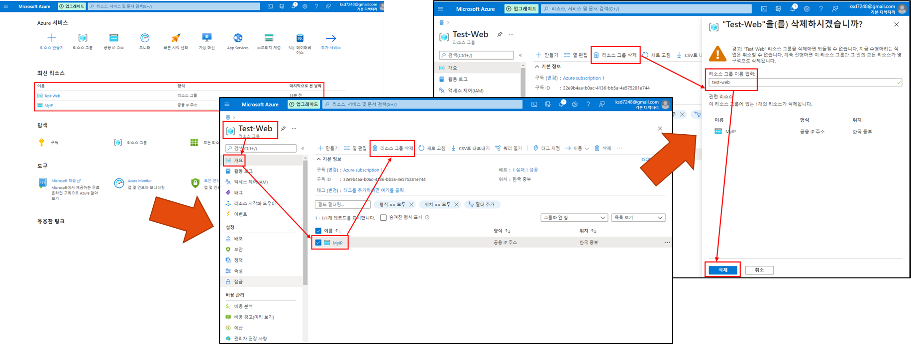 4.1.2. 개요 -> MyIP리소스 -> 리소스 그룹 삭제 -> 확인 창 요구사항 입력 후 삭제 클릭