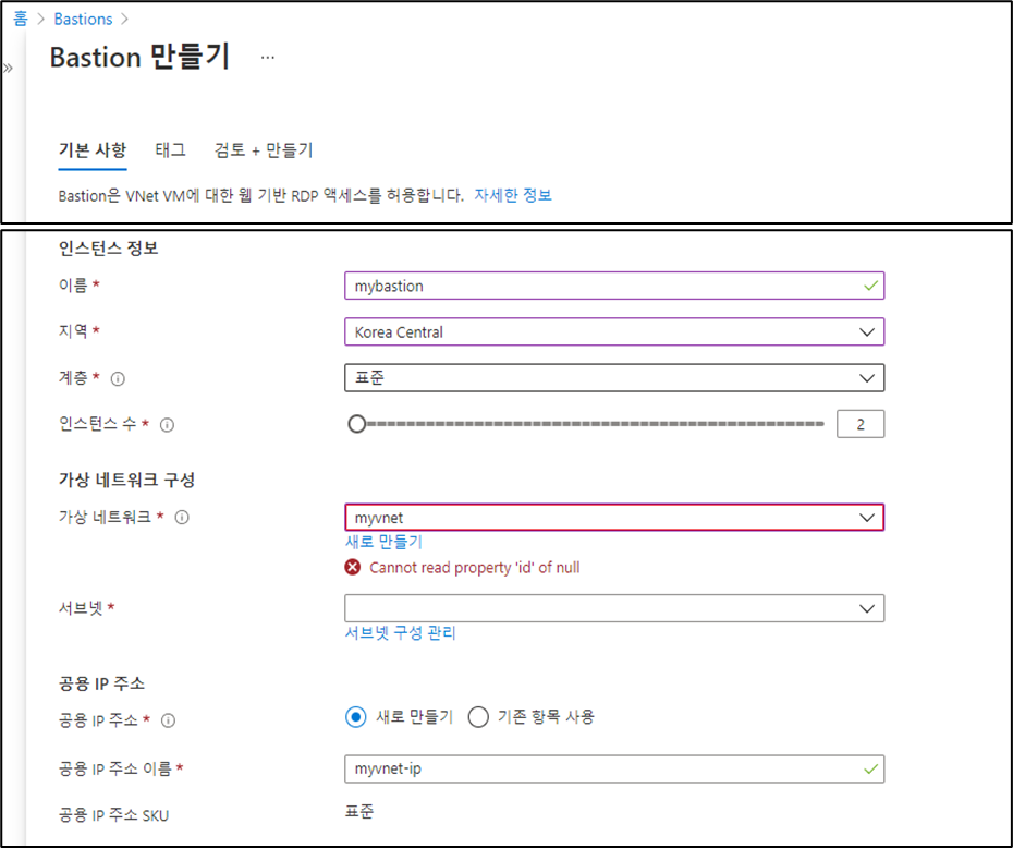 2.2.5. Subnet : myvnet에는 AzureBastionSubnet이 없음으로 새로 생성