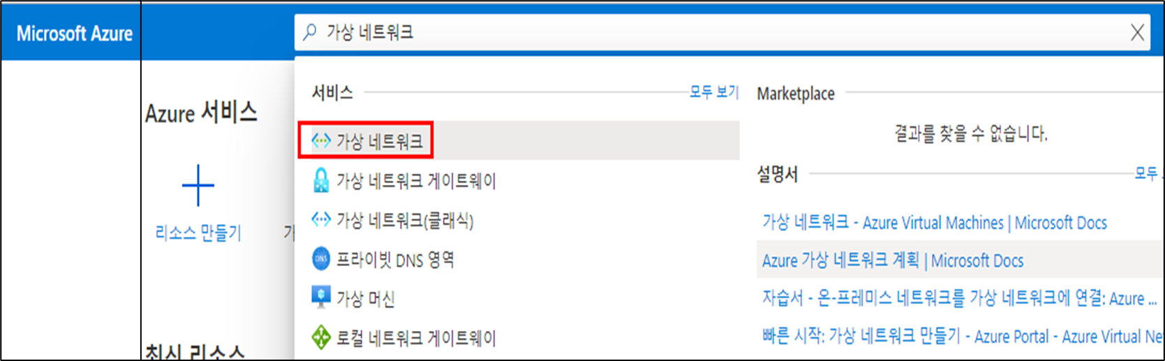 1.1. Azure Portal Login -> 상단 검색 창에서 "가상 네트워크"을 검색 후 선택