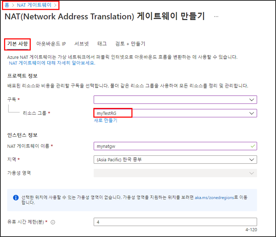 5.2.1. 구독 선택 후 Resource Group를 새로 생성하거나 기존 Resource Group 선택
