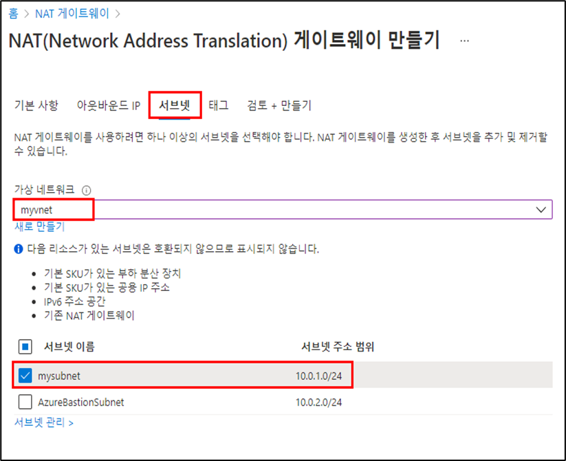5.4.3. Subnet : 선택한 가상 네트워크에 포함된 서브넷 mysubnet 선택