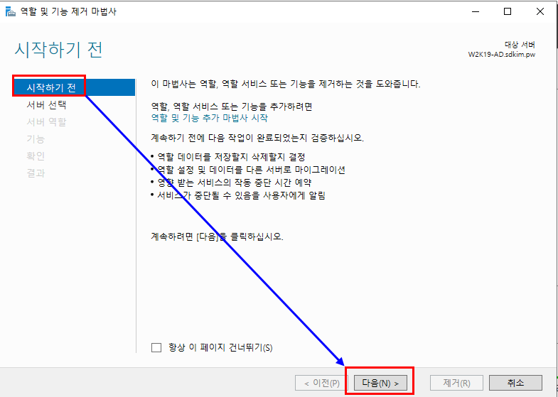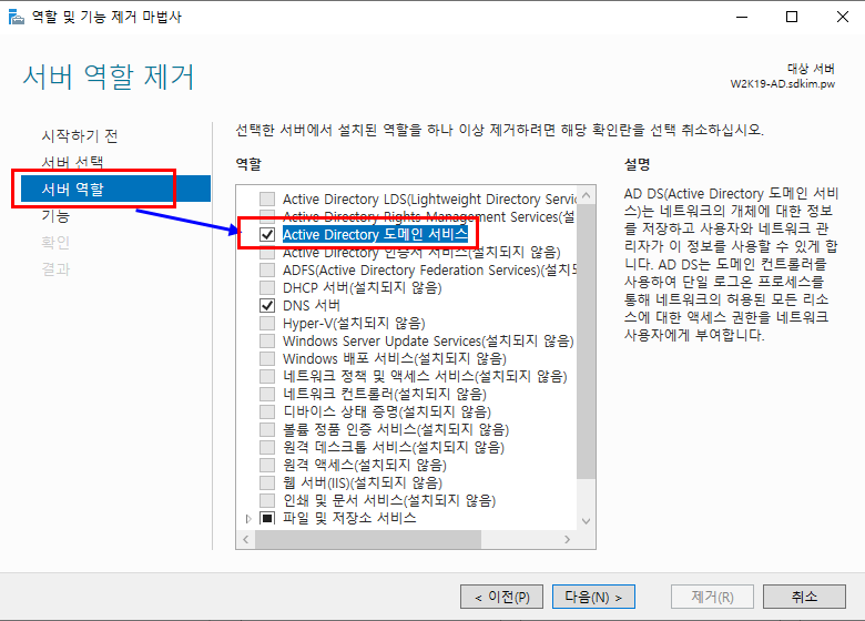 1.4.1. 삭제 할 역할 "Active Directory 도메인 서비스" 클릭