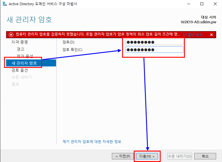 1.9.2. 새로운 패스워드의 경우 이미 Domain Controller이기 때문에 기존 암호 체계에 7글자 이상이 추가됩니다.