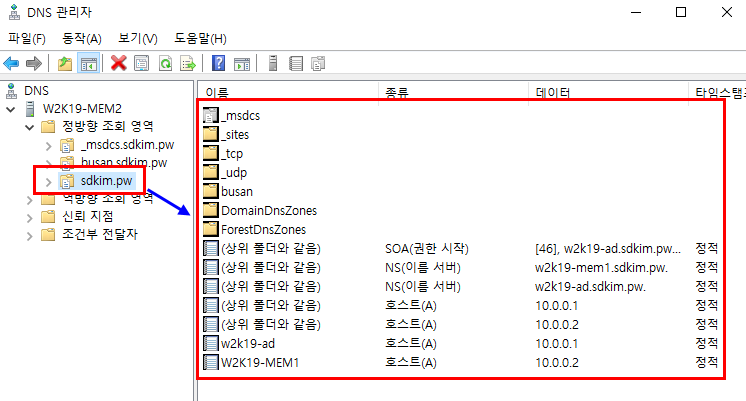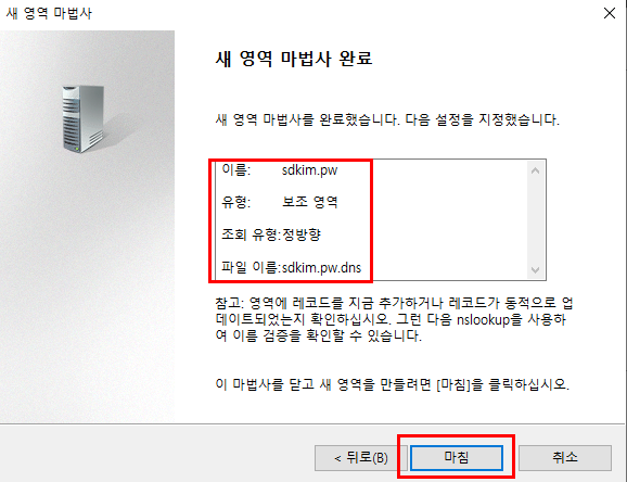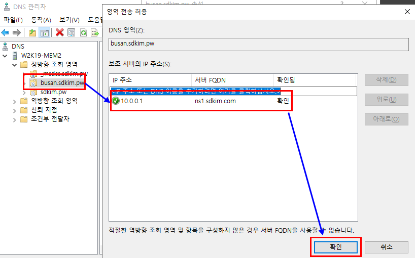 또한 이렇게 서로 다른 도메인으로 구성한 경우에는 상대방의 DNS 정보를 나의 DNS 보조 영역으로 구성하는 것이 원활한 통신을 보장하기 보조영역까지 구성하도록 합니다.