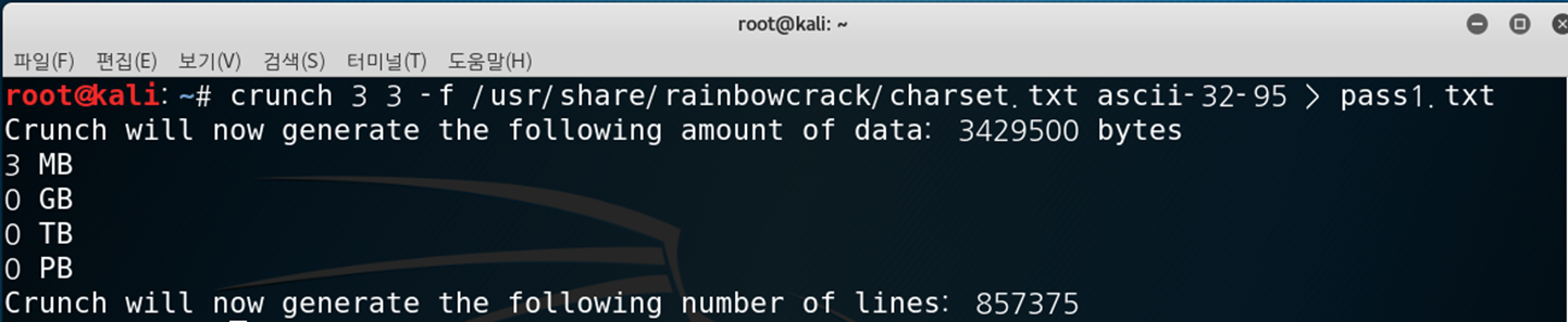 4.4.1. crunch를 이용하여 3글자의 모든 string을 포함하는 패스워드 파일 생성