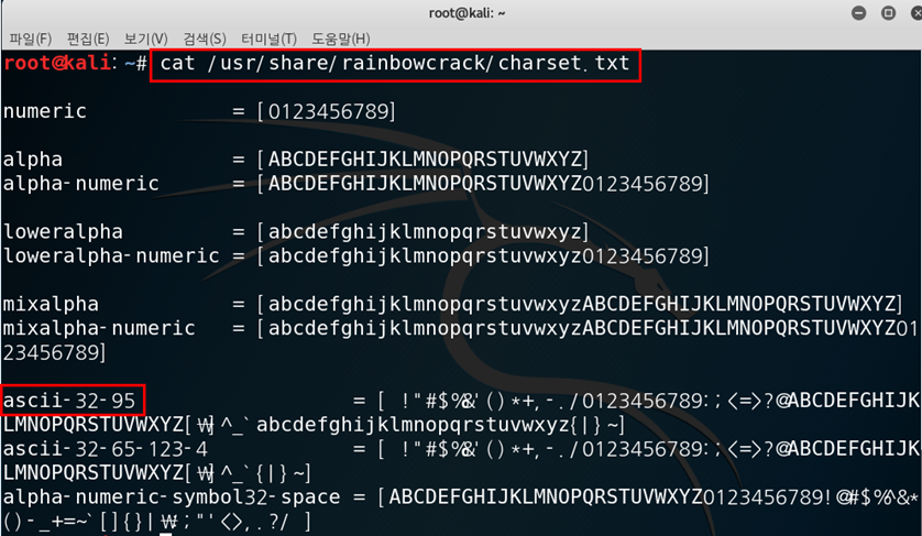 4.3.2. /usr/share/rainbowcrack/chareset.txt 파일의 ascii-32-95는 모든 문자열을 보유하고 있음.