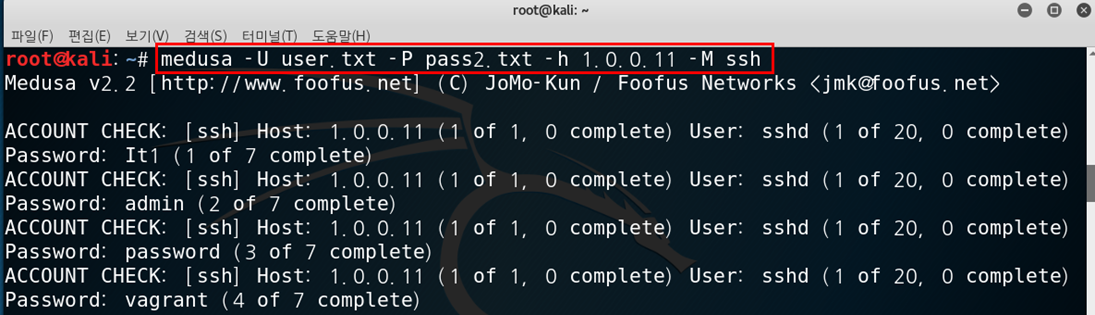 7.1.1. # medusa -U user.txt -P pass2.txt -h 1.0.0.11 -M ssh