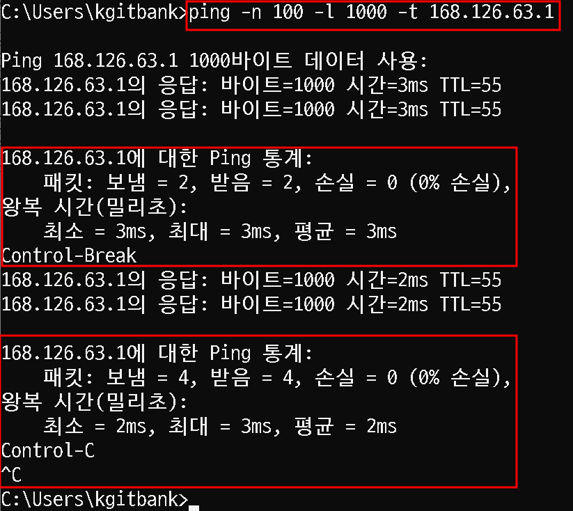 4.1.3. -t : 연속 ping 기본값은 4, 종료 : Ctrl+c, 통계 출력 후 계속 Ctrl+Break